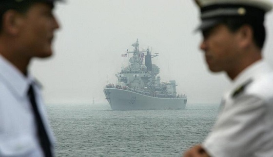 Chinese Navy officers wait dockside as a Chinese Navy warship escorting the arrival of the USS Curtis Wilbur arrives at Qingdao port on 13 September 2005. Photo by Getty Images.
